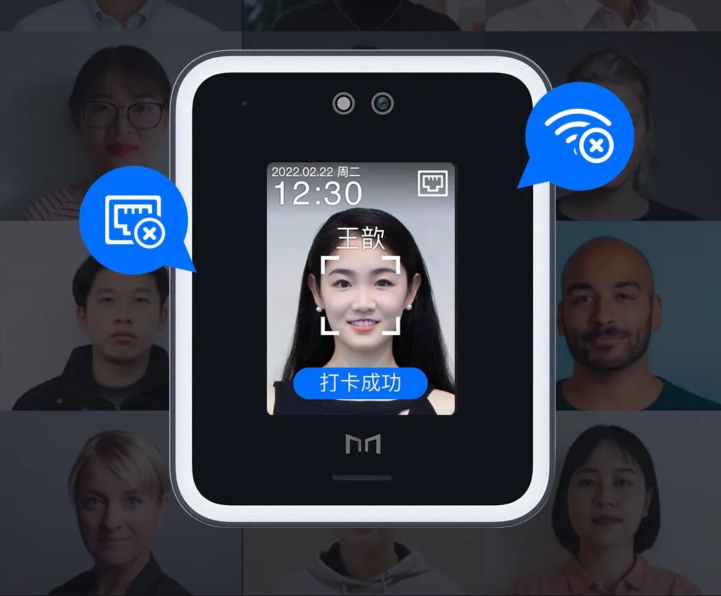 魔点Y2可以做到用户在0.3秒刷脸开门的同时,完成打卡。联网状态下Y2实时将考勤打卡数据上传云端;即使短暂断网,魔点Y2支持1500张人脸容量,也能正常打卡与开门。